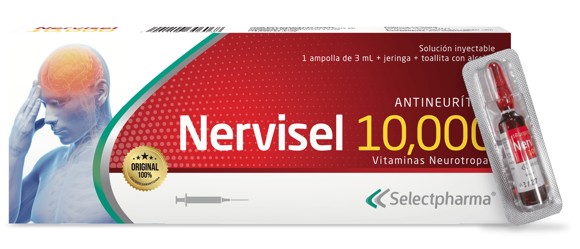 Nervisel® 10,000 de Selectpharma es una fórmula inyectable de vitaminas del complejo B (B1, B6 y B12 en alta concentración) indicada para el tratamiento de carencias vitamínicas y trastornos nerviosos. Está disponible en ampollas listas para aplicar.